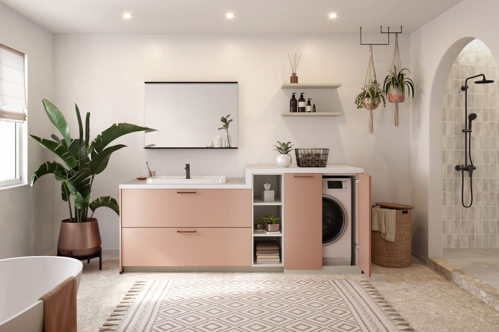 Wanneer je aan slimme badkameroplossingen denkt, vergeet dan niet de muren te benutten. Hang planken op of installeer een hoge kast. Door de verticale ruimte te gebruiken, creëer je meer vloeroppervlak en oogt de badkamer ruimer. Stel je voor dat je je tandenborstels, handdoeken en zelfs planten netjes op hun eigen plank kunt plaatsen. Dit is niet alleen een kwestie van ruimtebesparing, maar ook van stijl.