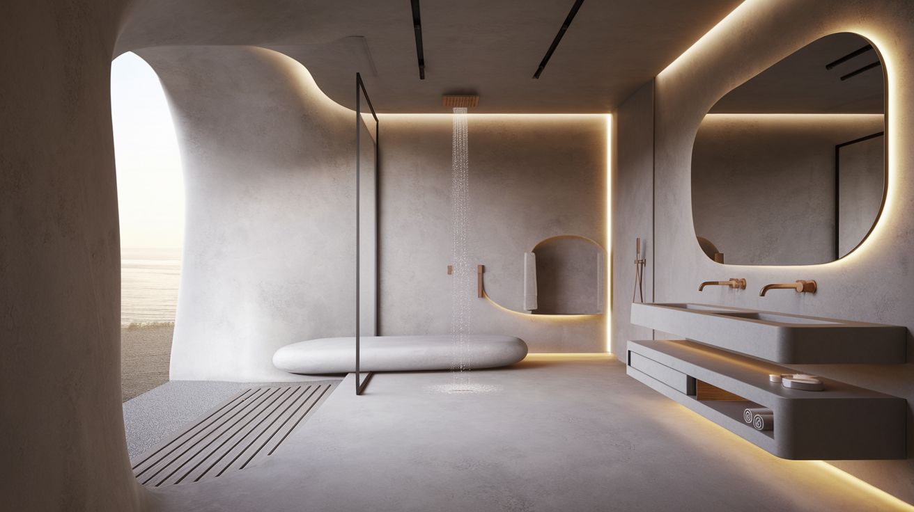 Strakke lijnen blijven, maar het harde randje verdwijnt. In moderne badkamerdesigns zie je meer afgeronde hoeken, matte afwerkingen en kleuren die rust brengen: zand, greige, klei en gebroken wit. Het resultaat voelt minimalistisch, maar niet kil.